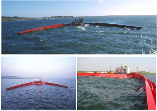 Overtopping devices are wave concentration systems that operate by means of a ramp along which waves travel to an elevated storage reservoir. This creates a head of water in a reservoir which is then released through low-head hydroelectric turbines as the water flows back out to sea. An overtopping device can use concentration arms to concentrate wave energy. In short, this device uses the energy of a breakwater barrier, where the water that brushes the barrier is stored in a tank and then passed through a hydro turbine [32]. Figure 12 shows some representative images of this device, while Table 3 indicates the main technical specifications.