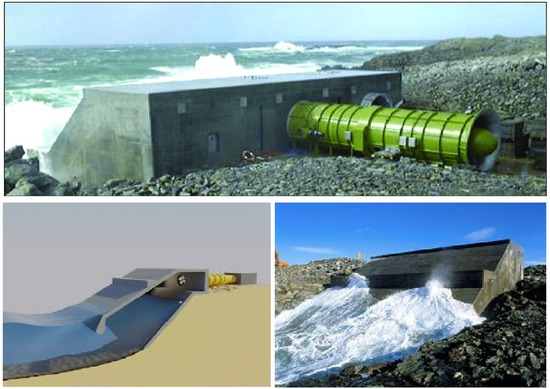 An oscillating water column consists of a partially submerged, resonance-tuned collector that is open to the sea below the water surface and contains air trapped above a water column. This water column moves up and down with the movement of the waves, acting as a piston, compressing and decompressing the air. This air is channeled through an air turbine, which harnesses the airflow as it is expelled and sucked back into the collector. A significant advantage of this type of technology is that it can be integrated into the shoreline. It uses the periodic level variation of a water column that is created within a special chamber connected to the sea, which in turn compresses a mass of air that drives a turbogenerator [32]. Figure 13 shows some representative images of this device, while Table 4 points out the main technical specifications.