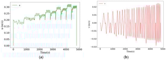 Simulations of the ship performing turning and zigzag maneuvers under calm water and wave conditions were conducted using Equations (1)–(4). Table 1 and Table 2 summarize the ship’s dimensions and the simulation environment. To enhance the generalization of the black-box model, turning tests were performed at rudder angles of ±5°, ±8°, ±10°, and ±15°, while zigzag maneuvers were executed at rudder angles of 5°/5°, 8°/8°, 10°/10°, and 15°/15°. These tests were conducted at speeds of 3 kn, 4 kn, 5 kn, 6 kn, 7 kn, and 8 kn. The data collection frequency for the simulation experiments was 100 Hz. Additionally, to improve the model training speed, we designed datasets with a sampling frequency of 20 Hz. The corresponding data are depicted in Figure 2 and Figure 3. Figure 2 illustrates the longitudinal velocity u, transverse velocity v, and yaw rate r of the ship during turning maneuvers in both calm water and wave environments, while Figure 3 shows the same characteristics during zigzag maneuvers.