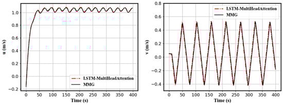 The previous section presented a comparative optimization analysis of model parameters, revealing that the LSTM-Multi-Head Attention-2 model exhibited the best forecasting performance. The optimal hyperparameters are detailed in Table 5. This section compares the forecasting accuracy of the LSTM, Multi-Head Attention, LSTM-Multi-Head Attention-2, Transformer, and GRU models. To ensure a fair evaluation, all five models were trained and tested using the same dataset, hyperparameters, and loss function, with a sufficient number of iterations to guarantee the convergence of the loss function. The models’ forecasting abilities were assessed using the RMSE error function, with the forecasting results of the five models illustrated in Figure 22 and Figure 23. Figure 22 indicates that the GRU model had the worst forecasting performance for the ship motion dataset used. In the u dimension, the LSTM-Multi-Head Attention-2 and Multi-Head Attention models demonstrated similar performance, and both highly coincide with the MMG data. In the v and r dimensions, LSTM-Multi-Head Attention-2 achieves the best performance. Regarding motion trajectory prediction, the forecasting results of LSTM-Multi-Head Attention-2 and Multi-Head Attention both highly coincide with the MMG data. The model training error curve suggests that the five models converge on the training set, among which the training errors of the Transformer model are the smallest, followed by the LSTM-Multi-Head Attention-2 and Multi-Head Attention models. However, the Transformer converges slowly. The RMSE distribution map shows that the comprehensive forecasting error of LSTM-Multi-Head Attention-2 is the smallest, further indicating that combining the LSTM and Multi-Head Attention models improves the forecasting ability of LSTM and Multi-Head Attention and is superior to the Transformer model.