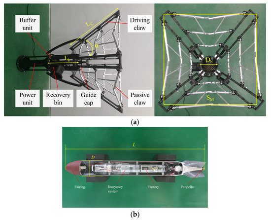 The driving arm of the PMG has features of both a fixed posture and active closure. When the driving arm is extended to a target posture and fixed, it can improve the recovery range for the AUV and allow the PMG to function as a passive docking station [23]. Once the AUV enters the recovery bin, the driving arm actively closes to secure and clamp the AUV. In this case, the PMG has both passive and active recovery capabilities. The structure of the PMG and that of the AUV to be recovered are shown in Figure 1, while their specific parameters are listed in Table 1 and Table 2.