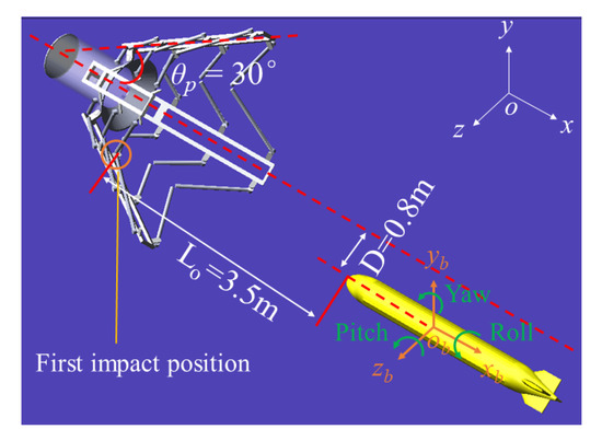 During AUV recovery with the PMG, the AUV first accelerates from an initial position at 0 m/s to a preset speed and then contacts with the PMG at this speed. After the collision between the two, the PMG secures the AUV to complete the recovery. As shown in Figure 2, a global coordinate frame is established to describe the positional relationship during the recovery. When approaching the PMG, the AUV is constrained to move only in the xy plane through adjustment of the buoyancy system. In the x direction, the initial position of the AUV is set as 3.5 m from the tip of the PMG’s driving claw. In the y direction, an offset of 0.8 m is set from the PMG’s axis to simulate the situation when the AUV cannot contact the central area of the PMG. The PMG’s driving claw completes the securing of the AUV by closing from 30° to 0°.