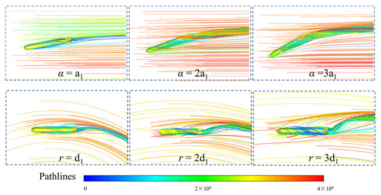 The hydrodynamic forces on the AUV consist of the viscous forces related to velocity, the inertial forces related to acceleration, and the corresponding moments. The hydrodynamic coefficients can be calculated with CFD software (Ansys workbench 2020) and theoretical equations [24,25]. The rectangular and annular fluid regions are chosen to more realistically simulate the flow field environment that the AUV may encounter during the recovery process. Specifically, the rectangular region simulates the linear and deflected water environments between the AUV and the recovery device, while the annular region simulates the rotational motion environment of the AUV. These two water environments closely resemble the AUV's actual underwater motion conditions. The rectangular fluid domain (Figure 3a) is used to calculate the hydrodynamic coefficients resulting from changes in the AUV’s angle of attack α, while the annular fluid domain (Figure 3b) is employed to calculate the hydrodynamic coefficients due to variations in the AUV’s radius of rotation. Figure 4 shows the velocity path lines of the AUV at different angles of attack α and radius of rotation r.