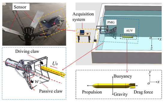 A tank experiment was designed to verify the accuracy of the simulation results for the collision process during AUV recovery, and a 3:1 scale physical and simulation model of both PMG and AUV is applied for cost effectiveness and ease of operation. The experimental setup and principle are shown in Figure 5. The dimensions of the pool are 25 m × 6 m × 2.5 m (length × width × depth), with a fixed platform installed at the pool’s edge and the PMG mounted on the platform so that the recovery bin is just submerged underwater. The AUV’s buoyancy is adjusted to keep it fully submerged below the water surface, at a height allowing proper navigation. During forward motion (before collision), the AUV remains aligned with the central axis of the PMG’s recovery bin. The AUV is controlled via a low-frequency remote to enter the PMG. The recovery process is conducted under different opening angles and grasping speeds of the PMG, which are controlled by a computer on the shore. During this process, the impact force data are collected with force sensors installed on the driving claw, and the recovery time is recorded.