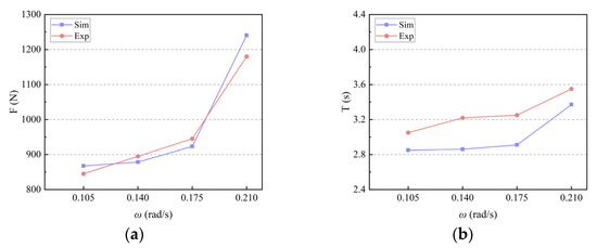 Figure 6 shows the collision position and the attitude of the AUV in the experiment and the simulation, while Figure 7 shows the curves for maximum impact force and the recovery time. The experimental and simulation results are basically consistent, with a maximum impact force error of 5.10%. The collision positions and attitude of the AUV with the main claw lead to discrepancies in the experimental results due to the positioning of the force sensor in the middle of the PMG main claw, and causes the experimental impact force to be higher or lower than the simulation. Additionally, during the AUV approach to the PMG, the simulation does not account for the influence of the surrounding flow field on the AUV flow field, and results in a longer simulated recovery time compared to the experimental results. In brief, the simulation of the AUV recovery process with the PMG is proven to be accurate.