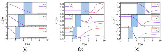 Displacement curves of the AUV during active and passive recovery: (a) x directions; (b) y directions; (c) z directions.