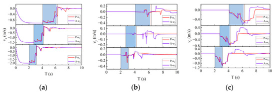Figure 9 presents the speed curves of the AUV during the recovery process at different initial speeds. In the x direction (Figure 9a), the AUV’s moving speed shows a gradual decline with the increase of initial speed. In the active recovery (purple curve), the AUV’s speed fluctuations decrease significantly, especially at higher initial speeds (such as u3), where speed fluctuations are more significantly reduced. In the y direction (Figure 9b), the smallest fluctuation amplitude in the active recovery is observed at the initial speed of u2. In the z direction (Figure 9c), the AUV’s moving speed of active and passive recovery is similar. Therefore, in the recovery process, the speed fluctuation of active recovery is lower than that of passive recovery, indicating that active recovery can reduce the speed fluctuation.