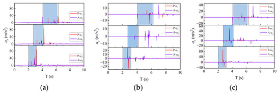 Acceleration curves of the AUV during active and passive recovery: (a) x directions; (b) y directions; (c) z directions.