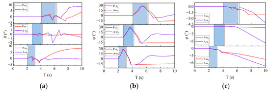 Attitude angles of the AUV under active and passive recovery: (a) Pitch angle; (b) Yaw angle; (c) Roll angle.