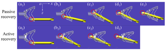 Figure 12 shows the collision situation in active recovery (a1–e1) and passive recovery (a1–d2) with the PMG under initial speed u2. In the passive recovery, the driving arm and passive claw provide passive guidance for the AUV, and there are altogether five collisions. In active recovery, the driving claw closes to increase the AUV’s yaw speed and reduce the number of collisions, and the number of collisions is four. Clearly, the difference in recovery time of the two modes is mainly generated by the second and third collisions. In the passive recovery, the AUV’s fairing collides twice with the PMG’s guide cap (b1–c1) before entering the recovery bin; in the active recovery, the fairing directly collides with the inner wall of the recovery bin (Figure 12b2), thus reducing the recovery time. Clearly, the active recovery improves the distribution of collision points.