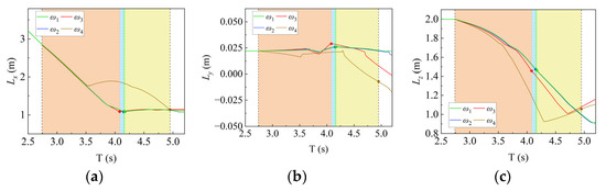This section primarily analyzes the motion of the AUV during its collision with the PMG at different closure speeds in active recovery, aiming to determine the optimal closure speed and enhance the recovery efficiency. Figure 13 presents the displacement curves of the AUV at different closure speeds (ω1-ω4). The black dashed line on the left indicates the start time of all collisions, while the dashed lines on the right correspond to the end time of collisions for ω3, ω2, ω1, and ω4, with different colored regions representing different collision durations. A comparison of the collision time reveals that the closure speed of ω3 results in the shortest recovery time for the AUV.