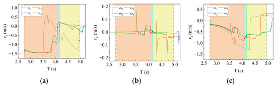Figure 14 presents the velocity curves of the AUV at different PMG active recovery speeds. Before the closure of the PMG, the AUV maintains a speed of around 1.5 m/s during its forward movement toward the PMG (Figure 14a). The velocity curves of ω1–ω3 are similar. At the beginning of the closure, the AUV speed experiences significant fluctuations, especially at ω4, where the AUV speed shows pronounced positive and negative oscillations, indicating a strong disturbance. As shown in Figure 14b, the AUV speed in the y direction is relatively small. However, the speed curves exhibit noticeable jumps at higher closure speeds (such as ω4), indicating that the AUV also experiences disturbances in the y direction under high-speed closure. As shown in Figure 14c, the speed in the z direction gradually decreases during recovery, but there are more intense fluctuations under high-speed closure conditions (such as ω4), reflecting the significant disturbance on the AUV in the vertical direction.
