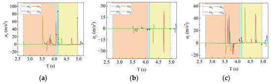 Figure 15 shows the acceleration curves of the AUV at different PMG active closure speeds. In the x direction (Figure 15a), the AUV acceleration exhibits significant fluctuations during the closure, especially at higher closure speeds (such as ω4), where the acceleration peaks near 70 m/s2 at the moment of closure. In contrast, lower closure speeds (such as ω1) generate much smaller accelerations, with peaks around 20 m/s2. Obviously, high-speed closure significantly increases the acceleration peaks, which can lead to increased structural stress on the AUV. As shown in Figure 15b, the acceleration in the y direction shows relatively small variations across different closure speeds, but higher speeds (such as ω4) cause brief jumps in acceleration during the closure, reaching over 7 m/s2. Although these jumps are short-lived, they may cause instantaneous lateral disturbances to the AUV, affecting the precise recovery. As shown in Figure 15c, the z direction acceleration behaves similarly to the x direction acceleration, showing noticeable fluctuations, particularly under high-speed closure conditions (such as ω4) with peaks exceeding 50 m/s2. This is due to the instantaneous impact in the z direction when the AUV contacts the PMG during high-speed closure.