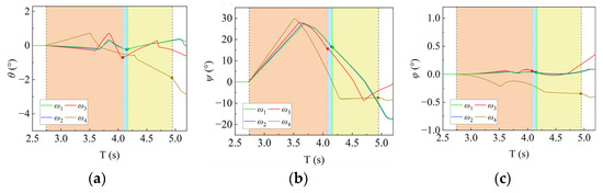 Figure 16 provides the AUV attitude angle curves at different PMG closure speeds. As shown in Figure 16a, the pitch angle θ shows minimal variation throughout the closure process, with only brief fluctuations. Under high-speed closure (such as ω4), the pitch angle exhibits some negative changes, but overall fluctuations remain within ±2°, indicating stable vertical attitude control and limited impact of the closure speed. As shown in Figure 16b, the yaw angle ψ changes significantly during the closure process, especially at higher closure speeds, with the maximum fluctuation reaching up to about +30°. At lower speeds (such as ω1), the yaw angle fluctuates less, indicating that lower closure speeds help maintain the AUV’s horizontal attitude. As shown in Figure 16c, the roll angle φ experiences very small fluctuations, staying within ±0.5°, demonstrating a good roll stability of the AUV throughout the recovery process.