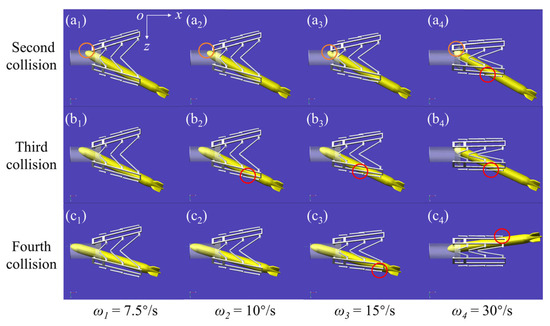 When the PMG closure speed is too low (ω1), as shown in Figure 17(a1–c1), the contact during recovery only occurs between the PMG recovery bin and the AUV’s head, without any contact between the PMG claws and the vehicle body. This increases the AUV’s yaw angle, leading to a longer recovery time. As the closure speed increases (ω2 and ω3), as shown in Figure 17(a2–c2,a3–c3), the contacts between the PMG claws and the vehicle body increase, which significantly reduces the AUV’s yaw angle and thus reduces the recovery time. When the PMG’s closure speed is too high (ω4) and the AUV’s head collides with the entrance (guide cap) of the recovery bin, as shown in Figure 17(a4–c4), the AUV’s speed and acceleration in the x and y directions is increased, which increases the yaw angle and pushes the vehicle to head toward the -z direction. Although the passive claws collide with the vehicle body to effectively reduce the yaw angle, the resistance in the x direction becomes stronger, increasing the number of collisions and the recovery time. This aligns with the previous conclusions about the collisions and AUV movements.