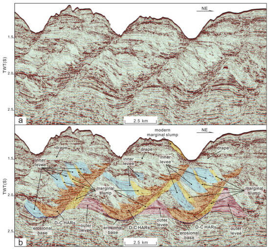 (a) Uninterpreted and (b) interpreted seismic profile located in the middle reach of the CLSs showing major architecture elements including the erosional base, outer levee, inner levee, channel-axis fills (D-C HARs, discontinuous and chaotic high-amplitude reflectors), marginal slump, and drape. Note the outer levee, shown in the shape of an irregular triangle, and inner levee, indicating multiple stepped parallelograms, and wedge-shaped or irregular geometries. See Figure 2a for the profile location.