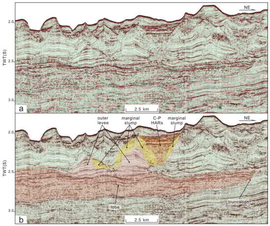 (a) Uninterpreted and (b) interpreted seismic profile crossing the lower reach of the CLSs showing some of the major architecture elements, including the outer levee, marginal slump, channel-axis fills (C-P HARs, continuous-parallel high-amplitude reflectors), and lobe. Note the truncation between the lobe and surrounding deposits. See Figure 2a for the profile location.