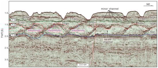 Sequence boundary T3 is a distinct regional erosional surface in the study area. It separates an underlying thick sequence of middle-to-high amplitude, with continuous and parallel reflections from the overlying CLSs (Figure 5). According to the results of a drilled well in the study area (BY6-1-1) [], the age of T3 is 10.5 Ma, indicating that SQC and the development of CLSs began in the late Miocene.