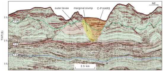 Lobes are found at the termination of CLSs and form when flows lose the confinement of the channel walls. The lobes in the study area consist of lenticular intervals, characterized by a high amplitude parallel to chaotic reflections, and show a clear, unconformable contact with the adjacent formations (Figure 4). Lobe deposits are overlain by CLSs in Figure 4, which has two implications: (1) the development of the upper and lower CLSs was separated by a significant break and (2) the overall channel–levee–lobe system was prograding over time.