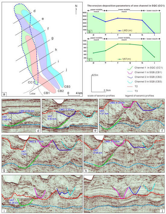 Stacking architecture and migration characteristics of channel CC1. (a) Distribution of channel CC1 and three related overlying channels: CB1, CB2, and CB3 and location of seismic profiles of Figure 7d–j. Note the different flow direction of CC1 and other channels developed in SQB. (b,c) The erosion–deposition parameters of CC1. Note that the longest lateral migration and thickest vertical aggradation occurred in the upper–lower middle reach. LMD—lateral migration distance; VAT—vertical aggradation thickness; LER—lateral erosive rate; SR—sedimentation rate. (d–j) Seismic profiles across CC1 from the uppermost to lowermost positions of the available seismic data. Note that the channel located on the top of CC1 along the migration route changed from CB3 (d) to CB2 (e), then to CB1 (f–h), and the most prominent migrating features occurred within the upper–lower middle reach of the channel. See Figure 2b for the profile location.