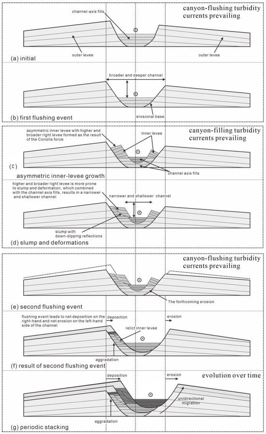 During the canyon-flushing events (Figure 8a,b), erosion dominates, causing the channels to widen and deepen. At the same time, the outer levees develop, and channel-axis fills and an erosional base form. Such short-lived canyon-flushing periods are predicted to be followed by long-term canyon-filling periods, during which erosion plays a minor role and deposition progressively reshapes the morphology of the channel. Flows are confined by outer levees and may slow to less than 0.4 m/s, which favors the development of asymmetric inner levees under the Coriolis force. The Coriolis force causes turbidity currents to preferentially overspill from the right side of the channel (looking downstream) to form a higher and broader right-hand inner levee (Figure 8c). Similar asymmetric deposition patterns are often seen in the Northern hemisphere, e.g., the distribution of marine litter items even at low latitudes ~18° N [], as well as sediment waves [,] and the modern channel–levee system in the Japan Sea [,], Black Sea [], and Adriatic Sea regions [].