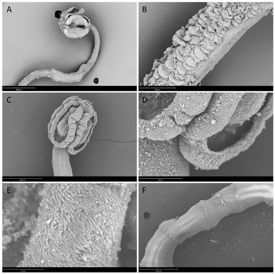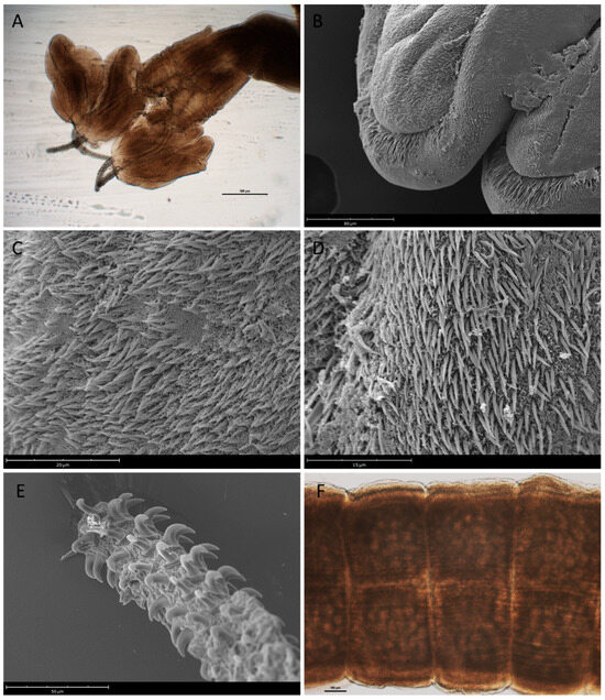 Nybelinia indica adult stage from Prionace glauca: (A) scolex (scale bar 500 µm); (B) detail of bothridial margin; (C) detail of microtriches over bothridial surface; (D) detail of microtriches over bothridial margin; (E) detail of hooked tentacle; and (F) mature proglottids (scale bar 100 µm).