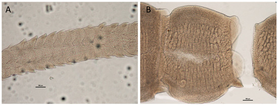 Antobothrium caseyi adult stage from Prionace glauca: (A) immature proglottids (scale bar 100 µm); (B) mature proglottids (scale bar 100 µm).