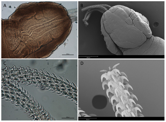 - Ruhnke, T.R.; Caira, J.N. Two new species of Anthobothrium van Beneden, 1850 (Tetraphyllidea: Phyllobothriidae) from carcharhinid sharks, with a redescription of Anthobothrium laciniatum Linton, 1890. Syst. Parasitol. 2009, 72, 217–227. [Google Scholar] [CrossRef]