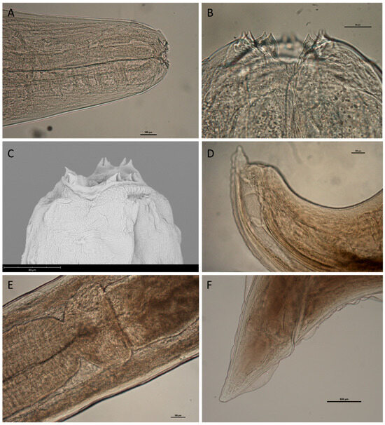 Adult general morphology: Body thick, tapering towards anterior end (Figure 5A). Three small semicircular lips, devoid of labial wings, each lip provided with two indented bifid teeth on the inside (Figure 5B,C); labial pulp-penetrating teeth tips. Interlabia absent. Dorsal lip with two double papillae, latero-ventral lips with a double papilla, a single latero-ventral papilla, and an amphid. Deirids small, rounded, slightly posterior to nerve ring. Excretory pore posterior to nerve ring. Esophagus enlarged at anterior end, measuring 6.5–9.3% of body length; intestinal cecum and esophageal appendix absent (Figure 5D).