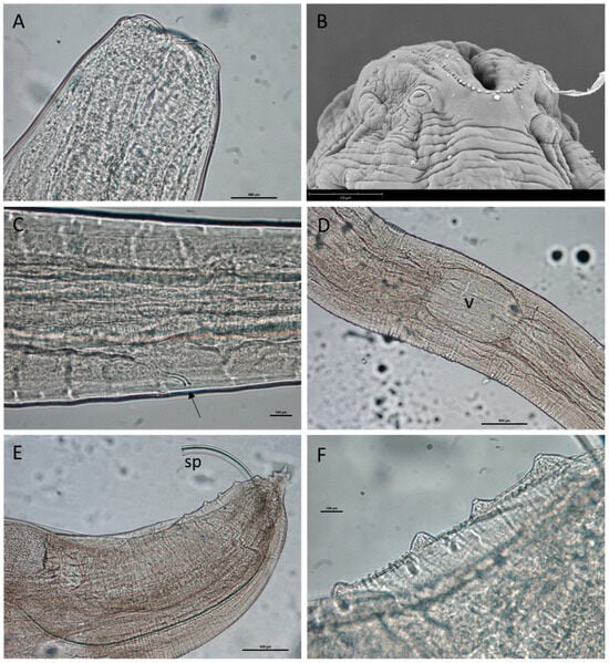 Adult males (n = 1): Tail conical (Figure 7D), 6–9 pre-anal papillae on each side of body, five pairs of ad-anal and post-anal papillae (Figure 7E); spicules similar in length; distinct and glandular ejaculatory duct; gubernaculum absent. Esophagus 2678.44 long; ventriculus 425.98 long, 273.20 µm wide. Excretory pore 550.44 from anterior end. Non-everted male apparatus 1861.35 long, everted male apparatus 1450.03 long.