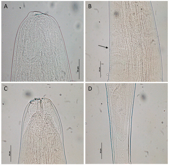 Fourth-stage larvae (n =3): Body 8316.29–9346.9 (8749.29 ± 534.66) long, 236.6–262.09 (248.55 ± 12.82) wide, tapering anteriorly (Figure 8A), with finely striated cuticle. Lateral alae narrow, extending from cephalic end to about tail tip. Cephalic end with three rounded lips 33.77–50.71 (39.71 ± 9.54) long, two ventral and one dorsal, each ventral lip bearing one double and one single papillae; dorsal lip larger, bearing two double papillae. Interlabium 13.7–16.13 (14.94 ± 1.22) long. Esophagus 889.45–989,49 (934.94 ± 50.63) long, broader posteriorly. Ventriculus almost spherical 85.06–136.66 (106.53 ± 26.87) wide, narrower than the esophagus. Ventricular appendix narrow, 747.38–877.29 (825.95 ± 69.10) long. Intestinal cecum 581.39–664.03 (633.51 ± 45.35) long. Excretory pore 322.01–399.34 (352.80 ± 41) from anterior end (Figure 8B), nerve ring 289.38–319.88 (301.53 ± 16.17) from anterior end. Tail conical (Figure 8C), 116.59–169.08 (134.94 ± 29.59) from cloaca to tip, with characteristic “cactus” appearance (Figure 8D).