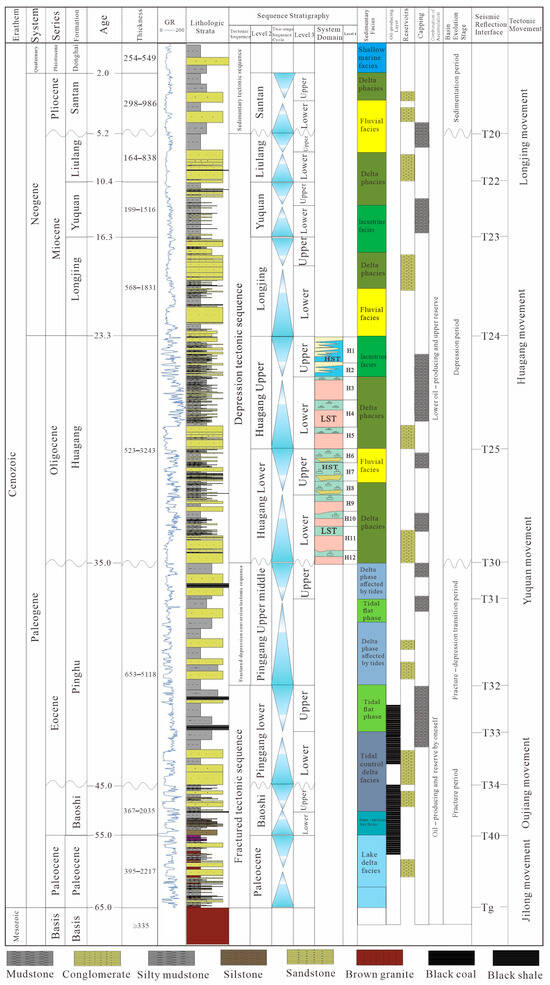 The East China Sea Shelf Basin has experienced five major tectonic movements throughout its geological history. Among these, the Yuquan movement at 35 Ma and the Longjing movement at 5.2 Ma resulted in two significant regional unconformities, referred to as the T30 structural layer and T20 structural layer (Figure 2). These interfaces, along with the Tg surface of the Keelung movement (65 Ma), divide the tectonic evolution of the Xihu Sag into three stages: a rift period (Keelung–Yuquan, 65 Ma–35 Ma), depression period (Yuquan–Longjing, 35 Ma–5.2 Ma), and regional subsidence period (Longjing–present, 5.2 Ma–present) [20].