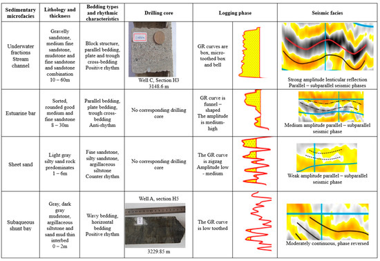The lithology primarily comprises thick light gray fine sandstone interbedded with thin siltstone and mudstone. The GR curve exhibits a box-type and serrated bell shape, reflecting variations in water body energy (Figure 4). Lateral migration frequently occurs within the channel. The typical bedding structures observed in subaqueous distributary channels, including basal scour structures, massive bedding, parallel lamination, and tabular and wedge cross-bedding, can be identified through drilling operations. Seismic characteristics often display pronounced amplitude lenticular reflections.