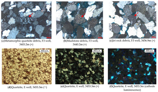 As one of the primary constituents of rocks, the luminescence of quartz varies depending on its source material. The observed color in the thin section of cathode-luminescent rock can be utilized to determine its origin [24]. Quartz derived from metamorphic rock typically emits brown light, while quartz originating from magmatic rock emits blue and purple light. Autogenetic-enlargement quartz generally does not exhibit any luminescence [15]. Through thin section observation, it is evident that most of the quartz in the Y-area is authigenic and non-luminescent. Some quartz displays brown luminescence, indicating a predominantly metamorphic parent rock with some contribution from magmatic parent rocks (Figure 6).