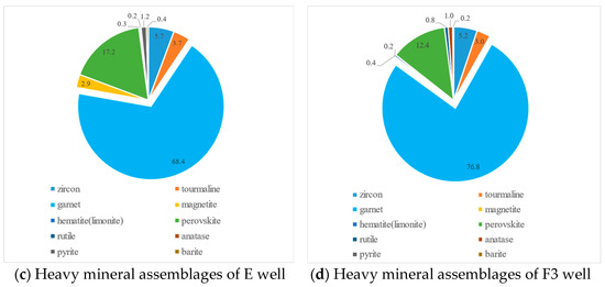 The predominant group of heavy minerals In the Y-area is garnet. Additionally, the rock in the wells contain magmatic-series heavy minerals like leucoxene, zircon, and tourmaline (Figure 7). Garnet content accounts for over 50% in each well and exhibits a gradual decline from north to south. Compared to the Q area near the western reef bulge within the central anticlinal belt region, where the content of the zircon–tourmaline–ilmenite series exceeds 60% in the Huagang Formation, with pyrite exceeding 10%, the Y-area has a significantly lower content of this series but an increased content of garnet, indicating that most of its provenance likely originates from the northwest Hupijiao Uplift, which is composed of metamorphic rocks. Furthermore, the presence of certain amounts of zircon, rutile, tourmaline, and ilmenites suggests a contribution from medium-acidic magmatic rocks.