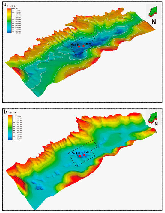 Paleo-geomorphological map of the Huagang Formation in the Y-area. (a) Paleo-geomorphological map of the upper Huagang Formation. (b) Paleo-geomorphological map of the lower Huagang Formation.