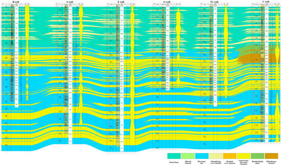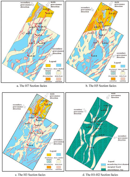 During the deposition period of segment H7–H4, there was a continuous deepening of the water body, resulting in longitudinally developed thick box sands that formed uninterrupted sheets, primarily deposited within underwater distributary channels and interdistributary bays. Estuary bar sedimentation also exhibited significant development. In the deposition period of section H3, as the water body became shallower and the lake plane shrank towards the vicinity of well C, plain sedimentation occurred in well C and northern areas characterized by coarser sandstone grain size and higher sand/area ratio. The transition from braided river delta plain to delta front-lake deposition took place progressively from north to south across the entire area, where deltaic sand bodies thinned out and reached their peak thicknesses from east to south (Figure 10).