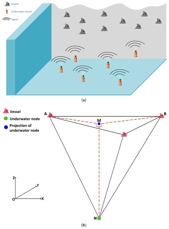 For computational simplicity, underwater nodes are projected onto the sea surface, where the vessels are located, effectively reducing the three-dimensional problem to a two-dimensional one. As shown in Figure 1b, the underwater node N is vertically projected onto the sea surface, with the projection point labeled as M. Equipped with pressure sensors, the underwater nodes can measure water depth. By calculating the X-coordinates and Y-coordinates of point M, the precise position of the underwater node can be accurately determined.