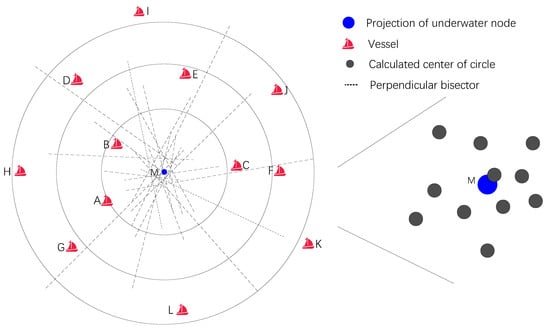 As shown in Figure 2, vessels A through L receive localization messages from the underwater node, calculate the message propagation time, and broadcast the results. Each vessel identifies other vessels from the received messages whose propagation time difference is smaller than a predefined threshold , forming a “same-circle set”—a group of vessels considered to lie on the same circle centered at the underwater node’s projection on the sea surface. According to the concentric circle center theorem, the perpendicular bisectors of any two points on different concentric circles intersect at the circle’s center. Thus, if the same-circle set includes at least two vessels, they can collectively participate in the calculation of the circle’s center. The size of the same-circle set can be controlled by adjusting . A smaller reduces localization errors, enhancing accuracy, but also decreases the number of vessels in the set, potentially limiting the localization coverage. Therefore, selecting an appropriate is critical to achieving a balance between localization accuracy and coverage.