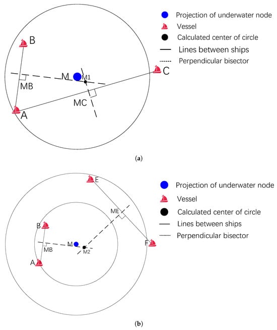 As illustrated in Figure 3a, when the number of vessels in the circular region is three or more, vessel A identifies vessels B and C whose propagation time differences relative to A are less than . The perpendicular bisectors of and , denoted as - and -, respectively, are constructed, with and serving as their respective bases. The intersection point of these bisectors, labeled as , represents the center of the circle that encompasses A, B, and C. Accordingly, the following formula is derived: