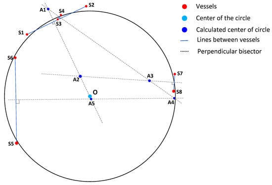 The circle center set is determined by calculating the intersection points of perpendicular bisectors formed by connecting pairs of vessels within multiple concentric circle sets. However, some intersection points may deviate significantly from the true circle center due to uncertainties in the process. As shown in Figure 4, point O represents the true circle center, while denote the eight vessels in the set, and indicate the calculated centers. Propagation delays and the parameter introduce positional deviations, resulting in vessels being slightly offset from the circle. For example, and , as well as and , are relatively far apart, whereas and , along with and , are closer together. When two vessels are very close—one inside the circle and the other outside (e.g., and , or and )—their bisectors’ intersection points with those of other vessels can deviate drastically from the true center, producing outliers such as , , , . These outliers substantially impact localization accuracy during clustering-based optimization. Therefore, it is essential to eliminate these anomalies before proceeding with the optimization process.