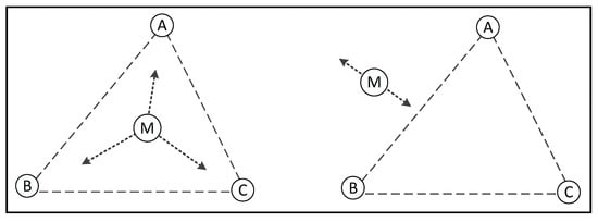 - Theory 1: If point M moves in any direction from its initial position while satisfying the conditions of Equation (8), it can be determined that M lies within the triangle, as illustrated in the left panel of Figure 5.