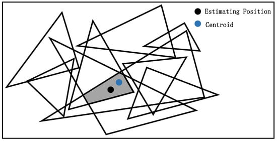 The approximate triangulation method involves combining multiple points to form triangles and calculating the centroid of their overlapping regions. Points from the circle center set are iteratively combined to construct triangles, which are subjected to CBPIT testing. Triangles passing the test are then processed using the approximate triangulation method. As illustrated in Figure 6, the process of CBPIT testing and approximate triangulation is repeated until all possible triangle combinations from the circle center set are exhausted. The centroid of the final overlapping shaded region is then computed to determine the final estimated position of the localization point. In Figure 6, the blue point represents the centroid of all points in the circle center set (referred to as the “N” point in Theory 3). The shaded region corresponds to the overlapping area of triangle combinations that pass the CBPIT test, and the black point indicates the final estimated position.