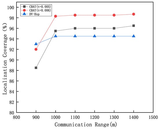 As shown in Figure 8, the node communication range increases incrementally from 900 m to 1400 m. The experimental results indicate that, with the same time error , for the CBAT algorithm, as the communication range increases, the number of vessels receiving localization requests gradually increases, and the node localization coverage also grows, initially rising and then stabilizing at a peak value. For the DV-Hop algorithm, as the communication range expands, the number of vessels it can receive and the number of nodes it can interact with both increase, leading to a gradual rise in its localization coverage. When the communication range is 900 m, since DV-Hop is a multi-hop algorithm, it can communicate with more nodes through node connectivity when the communication range is sufficient. Therefore, its localization coverage is higher than the CBAT algorithm. When the communication range is greater than or equal to 1000 m, and the time error is 0.005 s or 0.006 s, the number of vessels that nodes can communicate with increases in the CBAT algorithm. As a result, the localization coverage of the CBAT algorithm is higher than that of the DV-Hop algorithm, with the coverage reaching 98% when is 0.006 s.