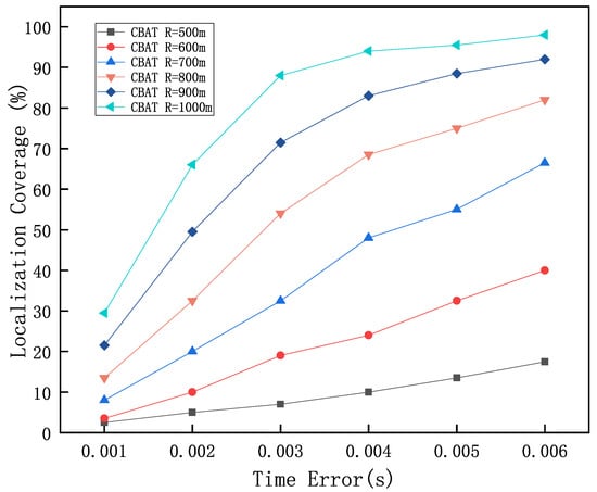 As shown in Figure 9, the time error increases incrementally from 0.001 s to 0.006 s. The experimental results indicate that, under the same communication range, as the time error increases, the number of vessels participating in localization within the same region also gradually increases. As a result, the node localization coverage of the CBAT algorithm increases, initially rising and then stabilizing at the peak value. When the time error is 0.006 s and the communication range is 900 m or 1000 m, the localization coverage of the CBAT algorithm exceeds 90%, with the highest coverage approaching 100% when the communication range is 1000 m.