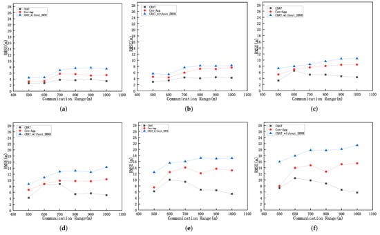 Node localization error with communication range under different time errors. (a) t = 0.001 s, (b) t = 0.002 s, (c) t = 0.003 s, (d) t = 0.004 s, (e) t = 0.005 s, (f) t = 0.006 s.