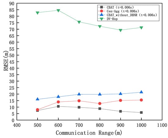 As the DV-Hop algorithm’s localization error is unaffected by time errors and depends solely on the communication range, Figure 11 compares the localization errors of CBAT clustering, CBAT_without_DBNR clustering, and Cen-Agg clustering under maximum localization coverage ( = 0.006 s) with that of the DV-Hop algorithm across varying communication ranges. Figure 11 demonstrates that the localization errors of CBAT, CBAT_without_DBNR, and Cen-Agg clustering are significantly lower than those of the DV-Hop algorithm. Among these methods, the CBAT algorithm achieves the highest localization accuracy, with its error stabilizing at approximately 5 m. In contrast, the DV-Hop algorithm exhibits a decrease in localization error as the communication range increases, eventually stabilizing at around 70 m. This trend is attributed to the fact that a larger communication range allows more nodes to participate in the DV-Hop algorithm’s multi-hop process, thereby reducing localization errors. In summary, under the same communication range, the CBAT algorithm consistently demonstrates the highest localization accuracy.