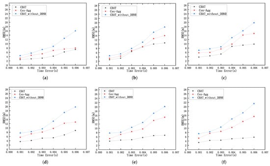 Localization error with time error under different communication ranges. (a) R = 500 m, (b) R = 600 m, (c) R = 700 m, (d) R = 800 m, (e) R = 900 m, (f) R = 1000 m.