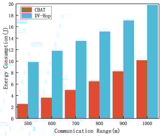Figure 13 compares the energy consumption of the CBAT localization algorithm and the DV-Hop algorithm under varying communication ranges. As detailed in this study, energy consumption primarily depends on the size of transmitted data packets and the communication range. Consequently, both algorithms show increased energy consumption with the expansion of the communication range, as illustrated in Figure 13. Under the same communication range, the CBAT algorithm demonstrates significantly higher energy efficiency than the DV-Hop algorithm. This efficiency stems from CBAT requiring only a single signal broadcast with a data packet size of 10 bytes, compared to the multi-hop broadcasting required by DV-Hop, which involves a data packet size of 13 bytes. Therefore, the CBAT algorithm consistently consumes considerably less energy than the DV-Hop algorithm. Specifically, under optimal conditions—when localization error is minimized and localization coverage is maximized (i.e., at a communication range of 1000 m)—the energy consumption of the CBAT algorithm remains below 10 J, substantially outperforming the DV-Hop algorithm. Table 4 compares the energy consumption of the two algorithms in Figure 13 under different communication ranges. In summary, the CBAT algorithm offers superior energy efficiency, making it a more effective choice compared to the DV-Hop algorithm. Table 5 provides a detailed comparison of the four algorithms mentioned in the simulation experiments. It can be seen that the CBAT algorithm outperforms the other algorithms in all metrics.