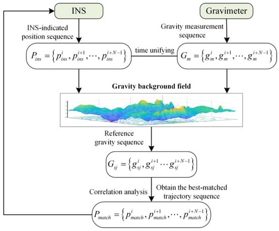 As shown in Figure 1, the GAINS primarily comprises the INS, gravimeter, gravity anomaly background field, navigation computer, and gravity-matching algorithms []. The INS provides comprehensive navigation parameters, including raw outputs from gyroscopes and accelerometers, angular velocity and acceleration, as well as attitude (pitch, roll, and heading), velocity (easterly, northerly, and up), and position (longitude, latitude, and altitude), which is a piece of essential navigation equipment for underwater vehicles. Gravimeters enable real-time measurements of gravitational values at the vehicle’s location, supporting both gravity database construction and matching navigation implementation. High-precision and high-resolution marine gravity anomaly background fields constitute fundamental infrastructure for marine exploration and applications. These datasets also serve as critical technical enablers for practical implementations in domains such as GAINS technology, demonstrating significant economic value and military strategic importance. In addition, matching algorithms represent a critical technical component within the GAINS. This paper primarily focuses on the improvement and innovation of matching algorithms.